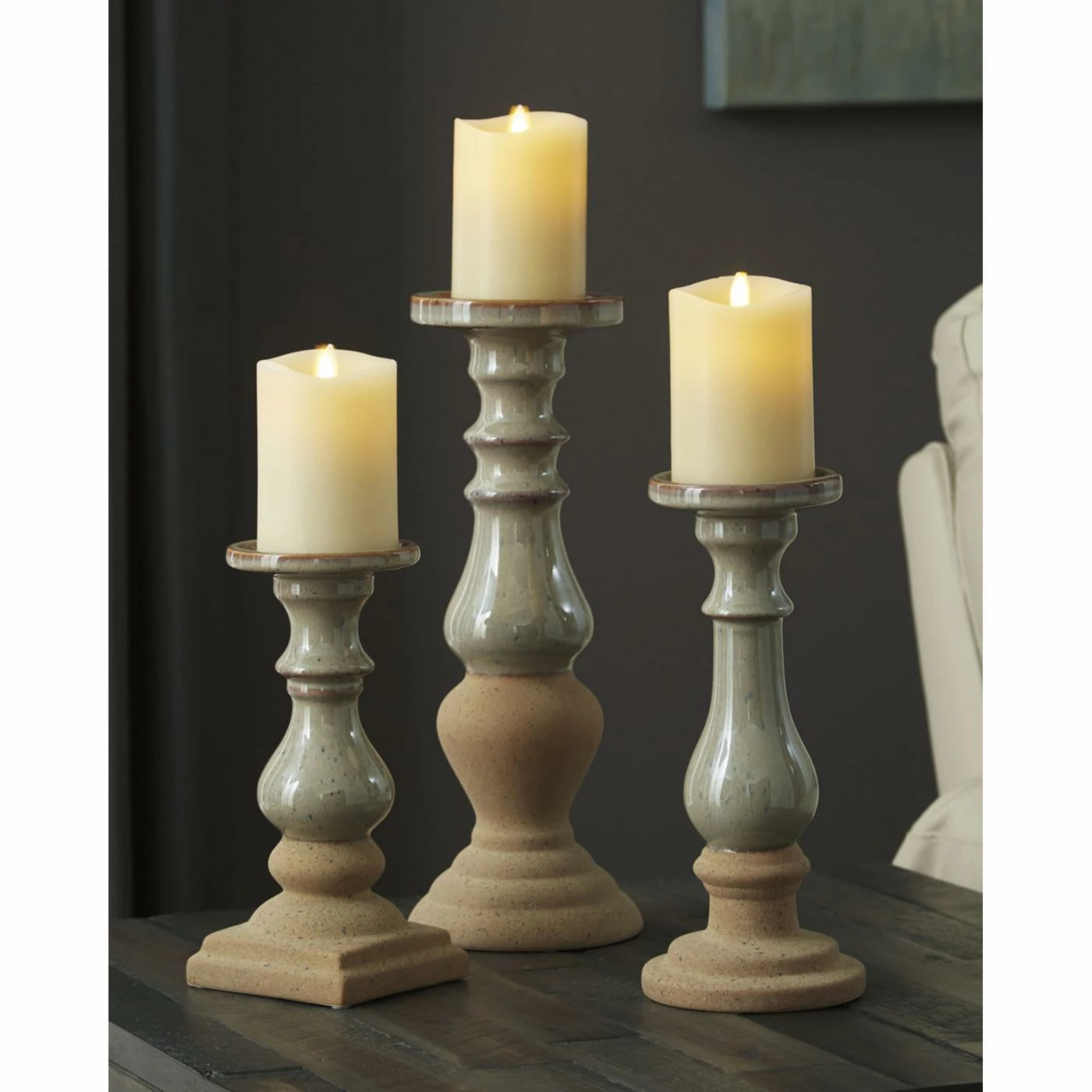 Candlelight is the best light. The Signature Design by Ashley 3 Piece Emele Candle Holder Set offers low light on your main table in a group or separated throughout your home. Theyβre crafted from ceramic to last and finished in modern silver.