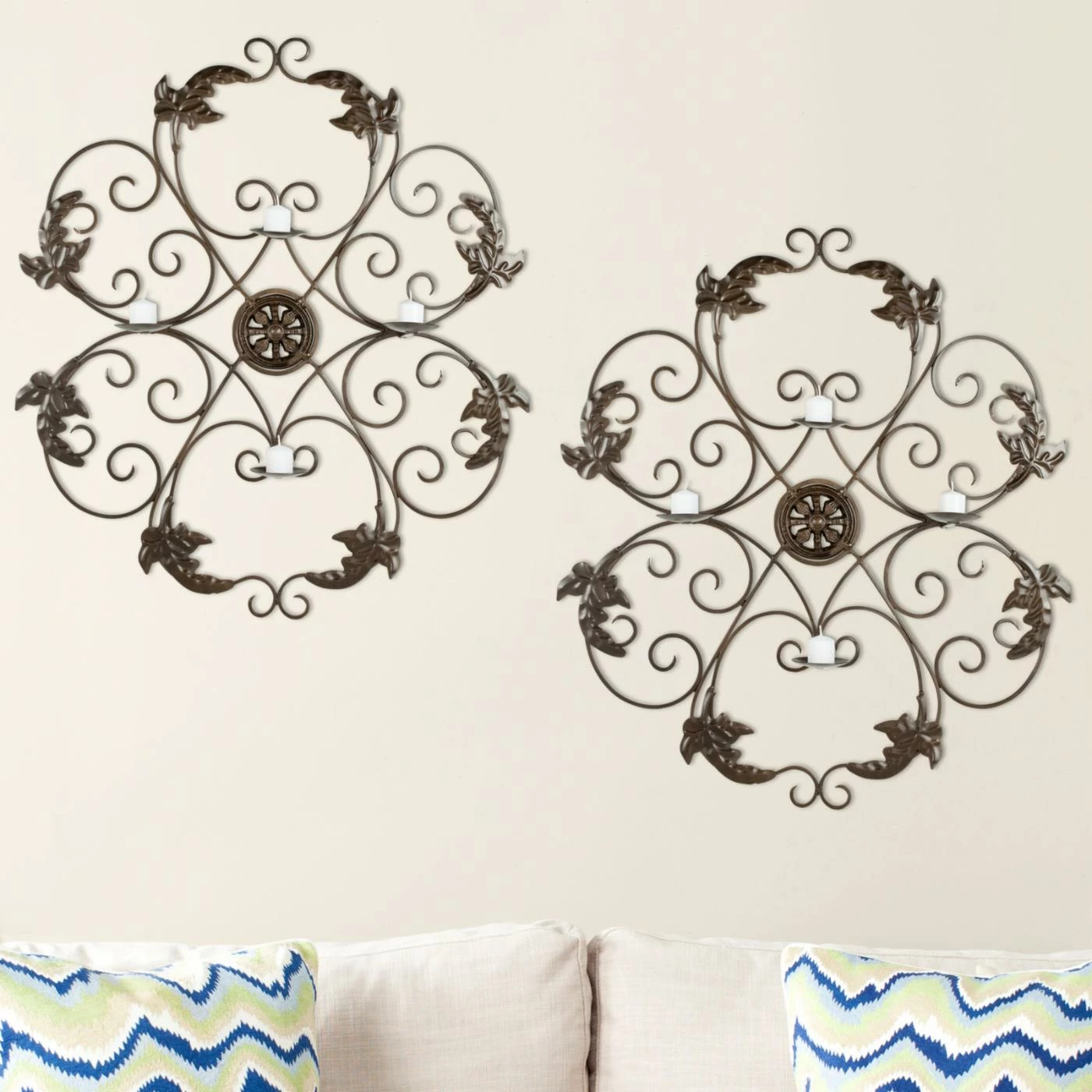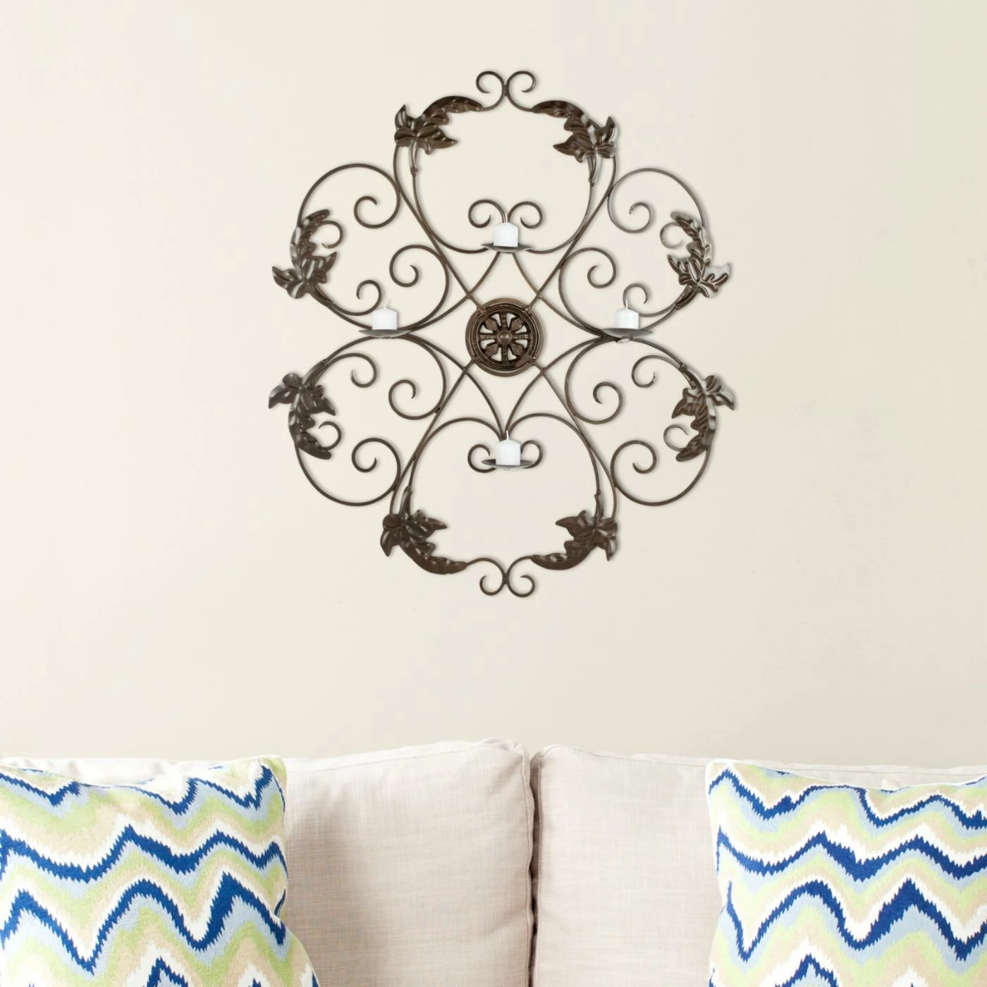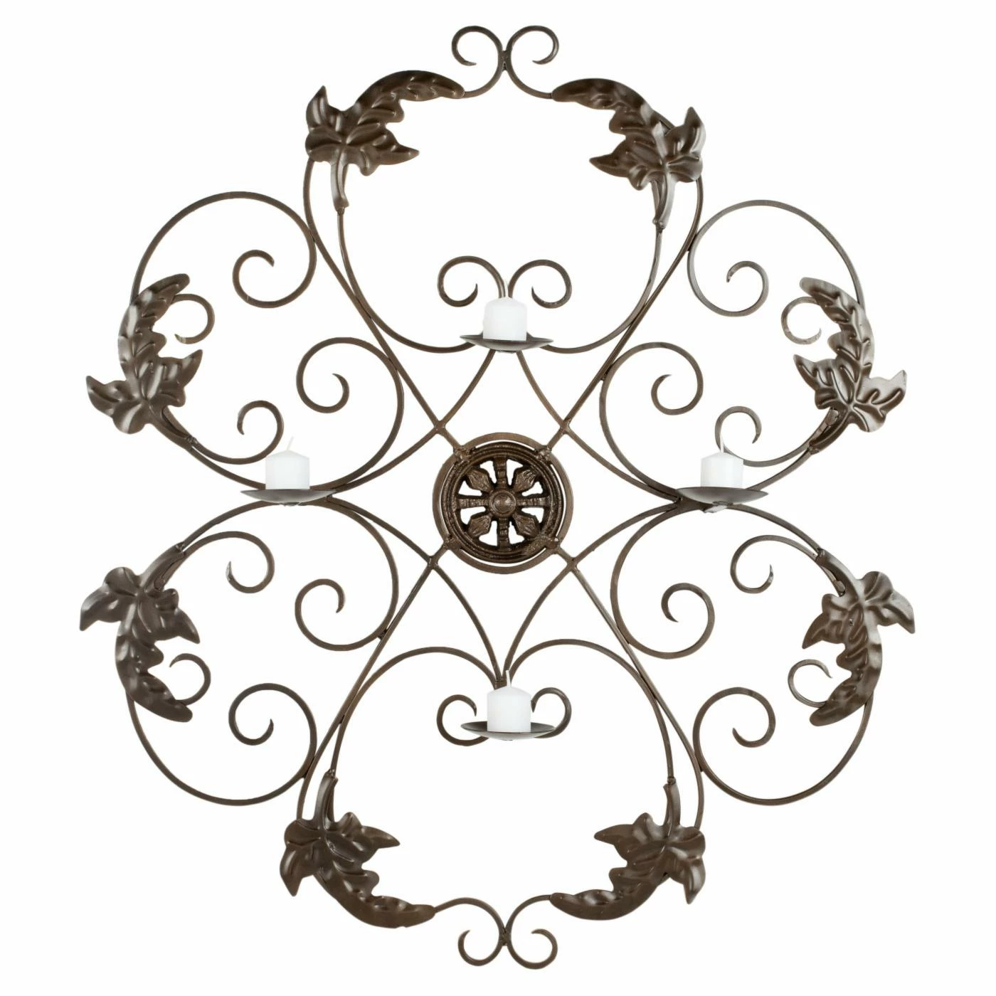 The romantic, swirling design of the Ivy and Leaf Wrought Iron Medallion Candle Wall Sconce β 32.3H in. lends an eye-catching accent to any room in your home. Four shallow glass cups are included in this wall hanging to add a glimmer of light, sure to add ambiance in the evening hours. The wrought iron construction is long lasting and easy to hang.