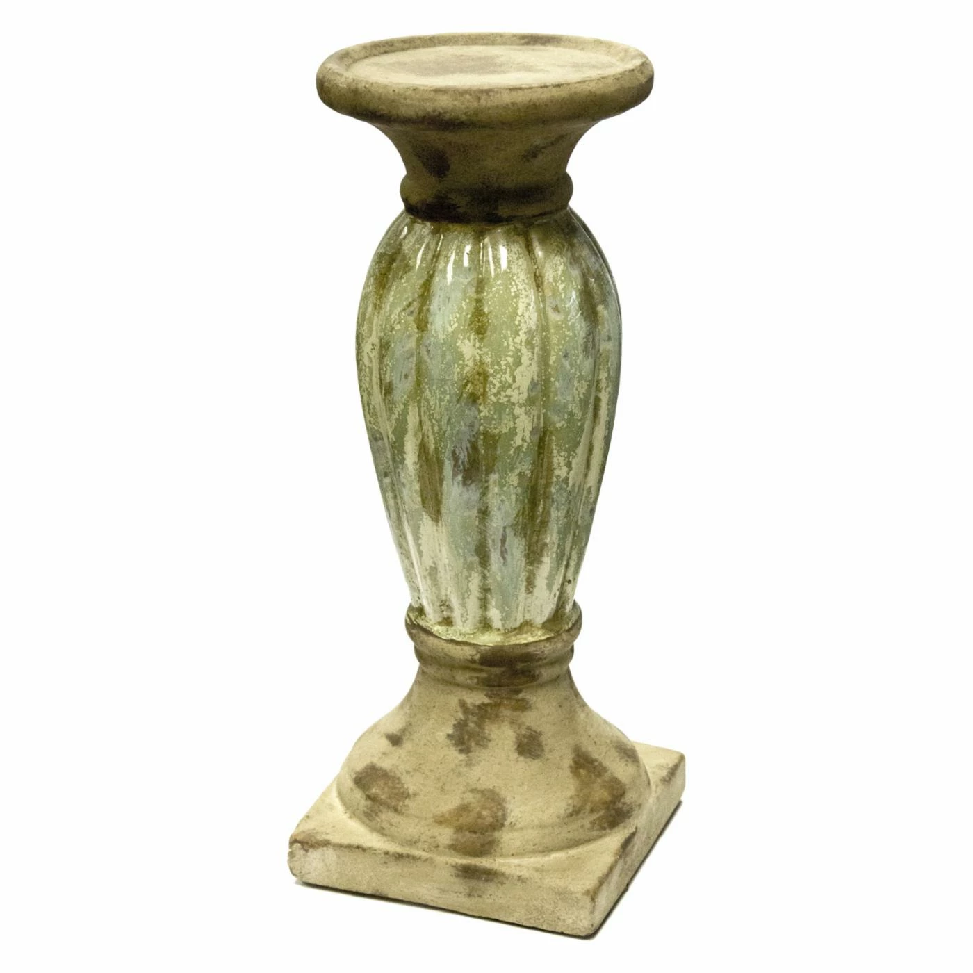 Glossy and textured finishes add contrast to the Sagebrook Home Pillar Candle Holder – Green. This piece is crafted from sturdy cement for long-lasting appeal, with a durable pedestal base to create a stable holder for your favorite candles. The weathered green hues create an antiqued look.