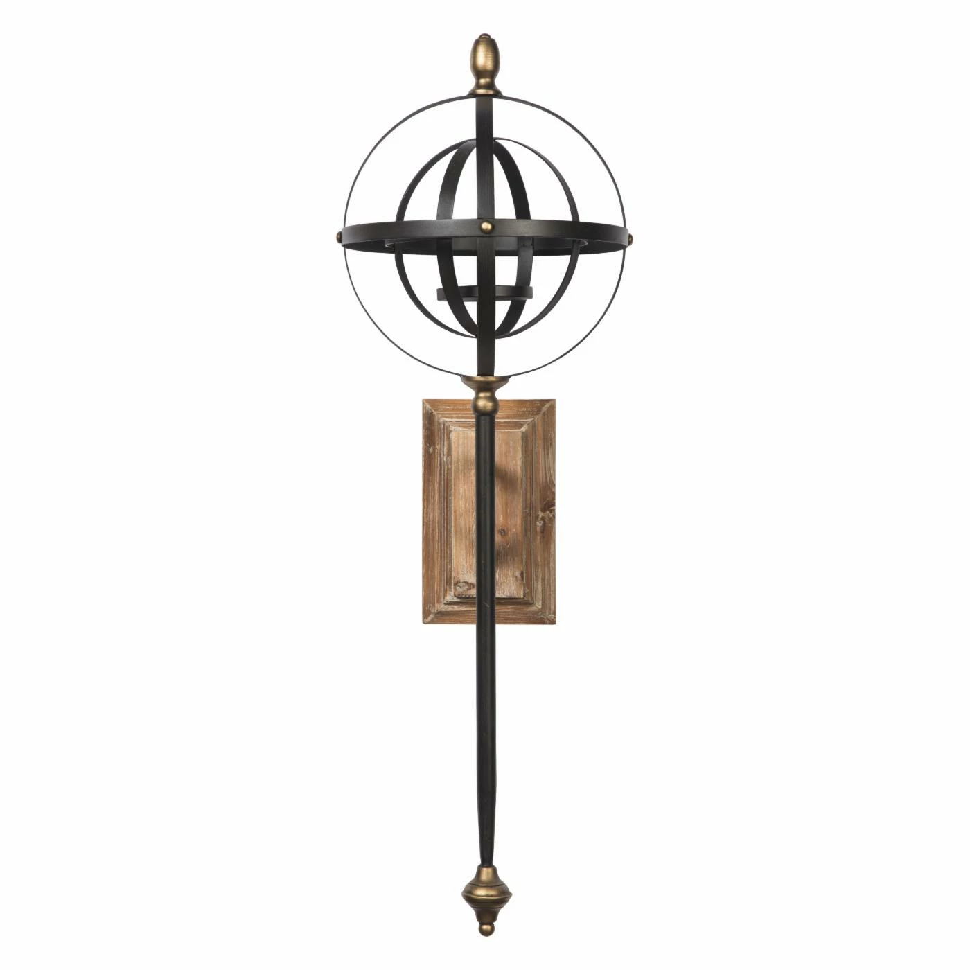 Illuminate your home in bold industrial style with the Ashley Dina Wall Sconce. Featuring an elongated design supporting an intricate top sphere, the metal construction is finished in rich black and gold colors. The center of the sphere supports a delicate candle for a unique lighting accent.