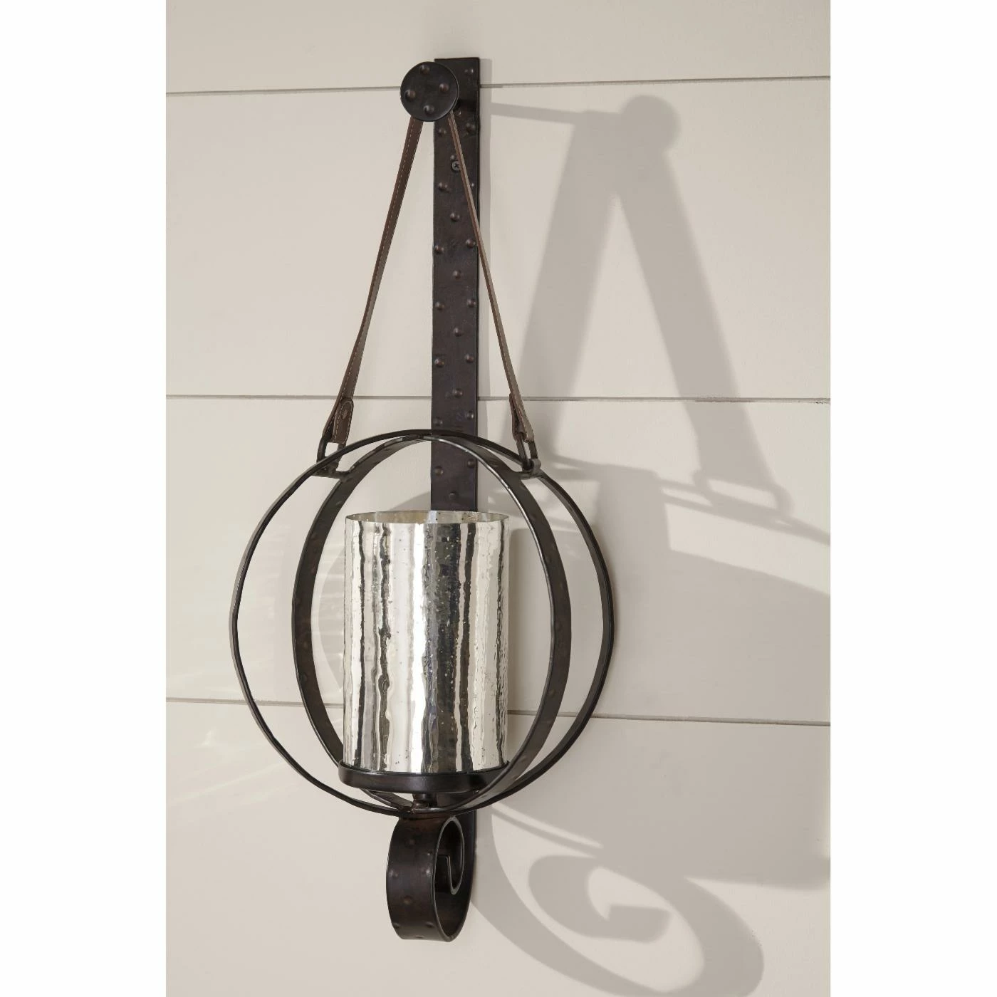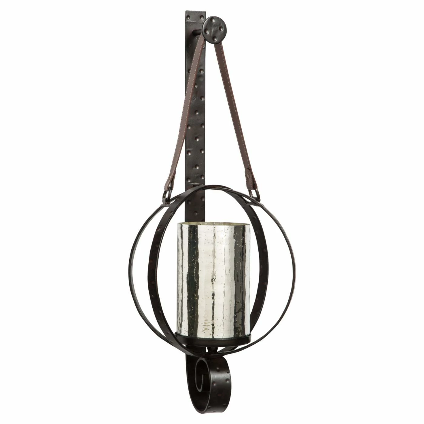 Incredible rustic detailing gives the Despina Wall Sconce Candle Holder a bold look, like its allover divot texture and leather strap. This incredible sconce is made of metal and mounts to the wall, holding an openwork sphere of hammered metal rings. A sleek silver mercury glass hurricane is nestled in the center to give it a bright, metallic pop.