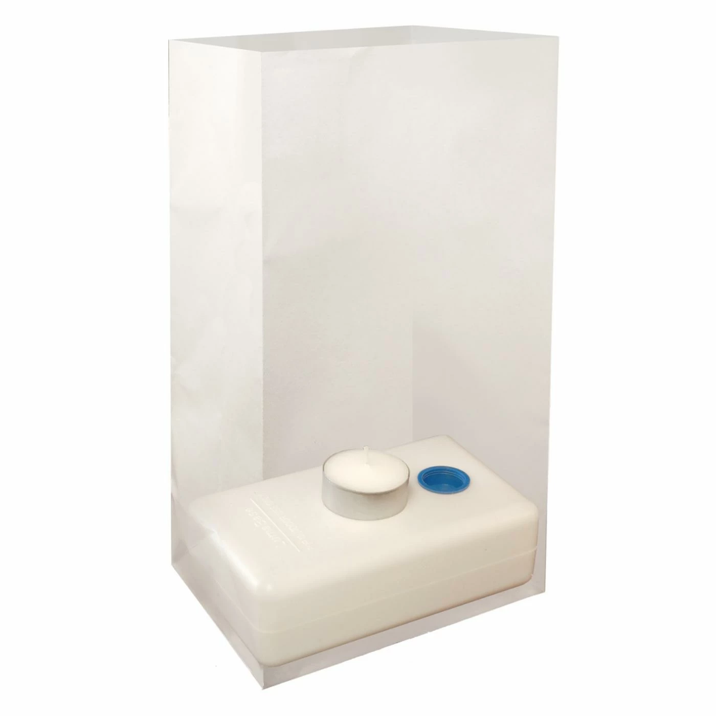 Display luminarias in clean, safe style with the LumaBase 100 Luminaria Weight and Candle Holder. Use this water-filled base in place of sand to hold the bag in place, and set your tea light into its specially-constructed, flame-resistant design to create an inviting glow for your outdoor dΓ©cor.