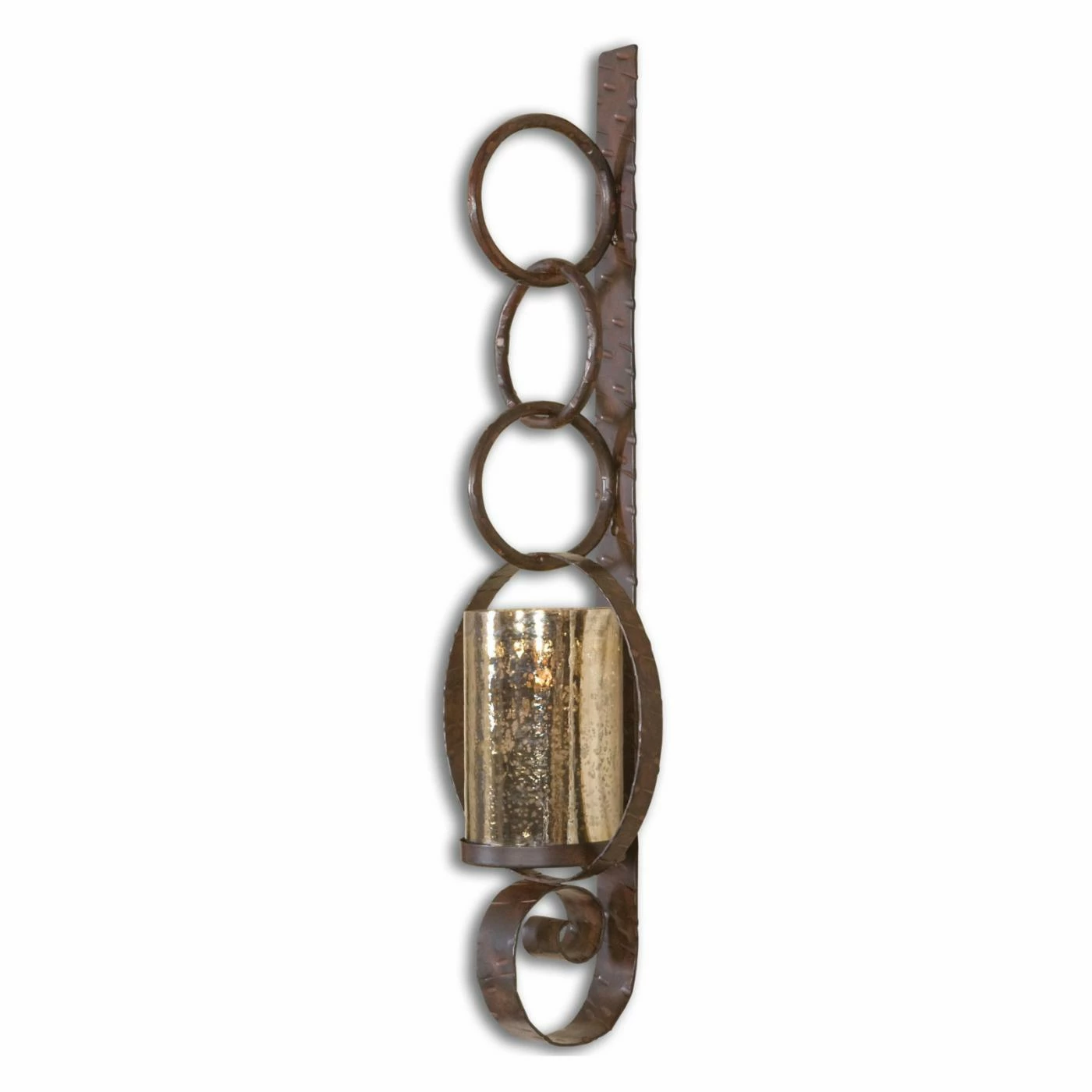 The Uttermost Falconara Wall Sconce Candleholder lets you accent your wall with a rustic base for a large candle. This handsome sconce features a frame built from durable iron, the wall brace of which curls into a scroll at the base. Interlocking rings form the body of the design; a large ring surrounds the candle base. A rust-brown finish, with burnished edges, accents the metal. A glass hurricane candle encasement (finished in an antique mercury color) keeps the included candle safe from drips and drafts.
