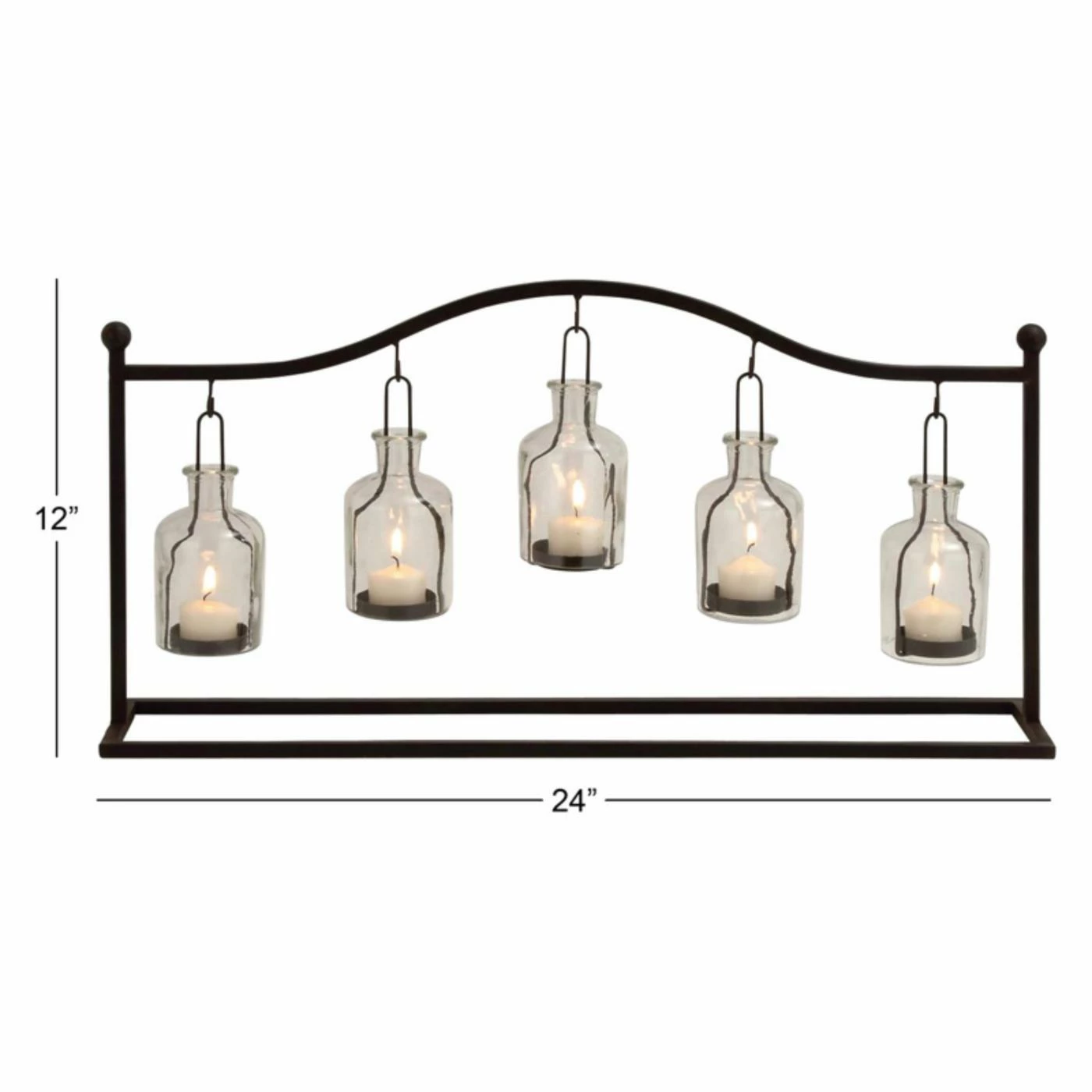 Five suspended glass jars cast a cozy glow from the DecMode 55544 Candle Holder. An arched black iron frame offers the perfect home for the dangling candlelight while lending visual interest and appeal to your home’s decor.
