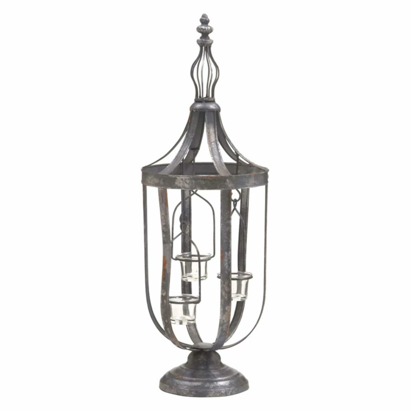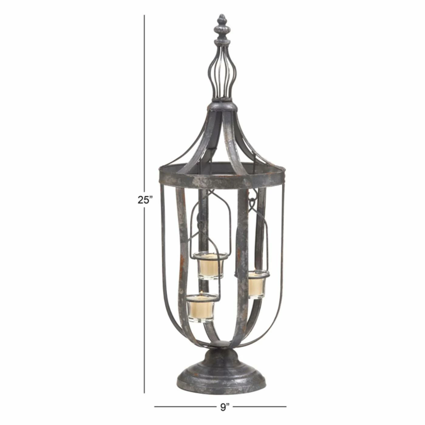 Beautifully suspended votive holders lend eye-catching style to the DecMode 87963 Lantern Candle Holder. A weathered gray finish brings plenty of vintage appeal to this pedestal-base lantern.