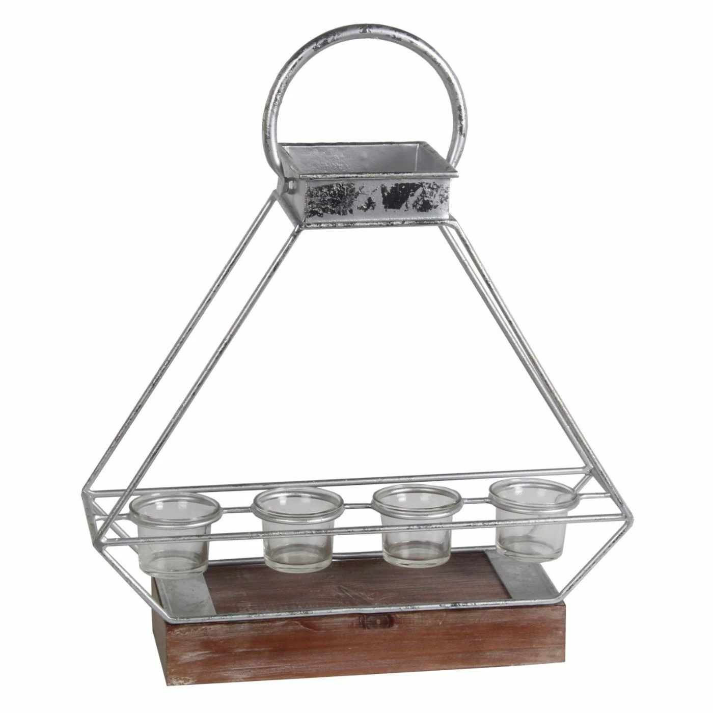 The Privilege International Metal Candle Lantern is a versatile accent piece that can be hung by the circular handle or stylishly placed atop a table, shelf, mantel, or bookcase with its square wood base. Featuring a distressed metallic finish offered in your choice of available color, this open hexagonal metal design features five glass votive holders to create a cozy glow.